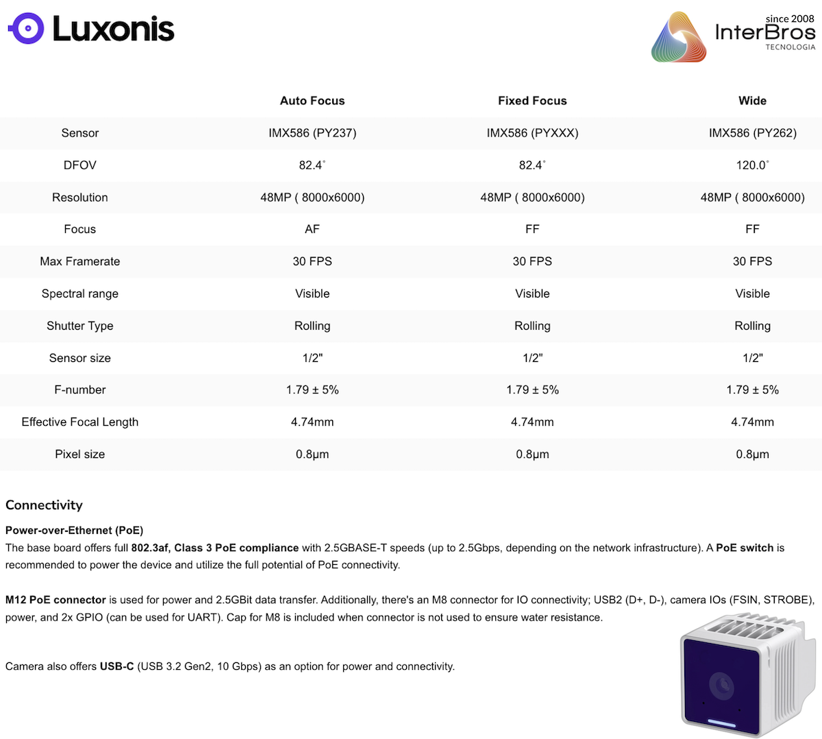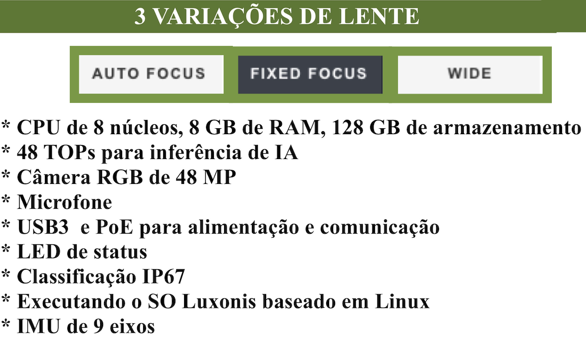 Este dispositivo autônomo é perfeito para visão robótica e sistemas automatizados , combinando uma câmera colorida de alta resolução com inferência de Rede Neural no dispositivo e recursos de Visão Computacional.