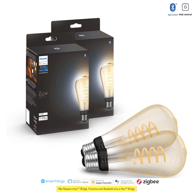 Capture a aparência popular das lâmpadas Edison, com uma bobina interna brilhante distinta e um globo transparente, com lâmpadas de filamento inteligentes. Estas lâmpadas LED inteligentes de estilo retro combinam a aparência de um design vintage simples com o poder da iluminação inteligente Philips Hue.
